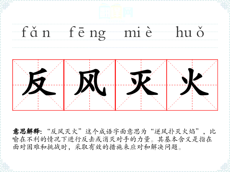 “反风灭火”这个成语字面意思为“逆风扑灭火焰”,比喻在不利的情况下进行反击或消灭对手的力量。其基本含义是指在面对困难和挑战时,采取有效的措施来应对和解决问题。