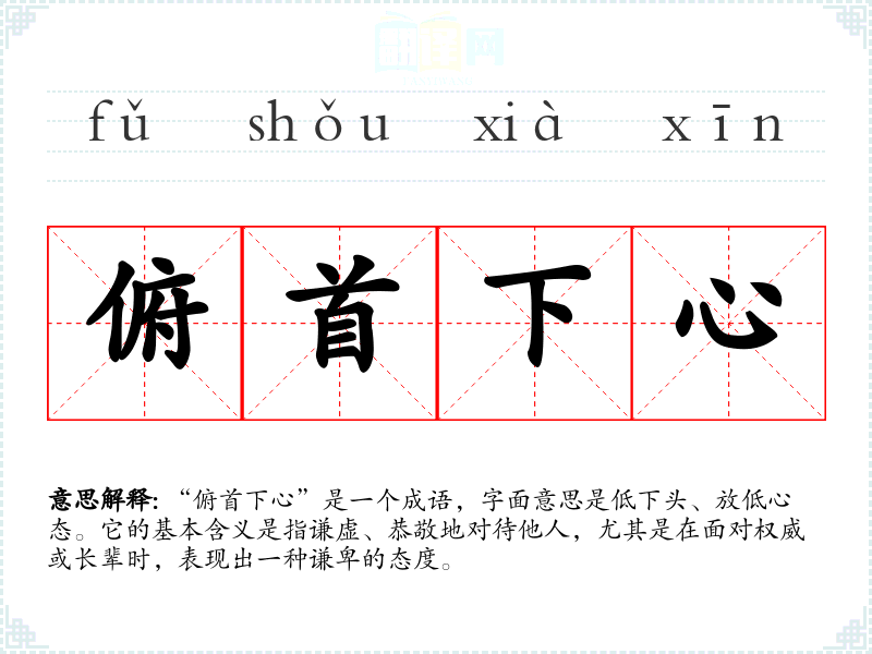 “俯首下心”是一个成语,字面意思是低下头、放低心态。它的基本含义是指谦虚、恭敬地对待他人,尤其是在面对权威或长辈时,表现出一种谦卑的态度。