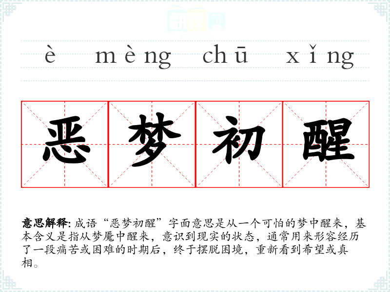 成语“恶梦初醒”字面意思是从一个可怕的梦中醒来,基本含义是指从梦魇中醒来,意识到现实的状态,通常用来形容经历了一段痛苦或困难的时期后,终于摆脱困境,重新看到希望或真相。