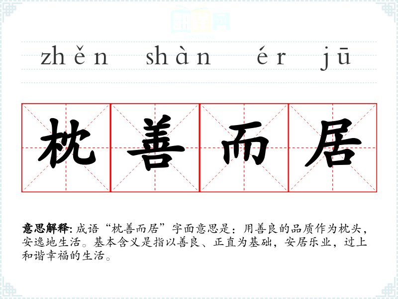 “枕善而居”出自《论语·雍也》,其中提到“居之无敢尚善”,意指人若能以善为基础而安居,生活自然能够和谐安宁。此成语体现了儒家思想中对善良、道德的重视,强调了德行在生活中的重要性。