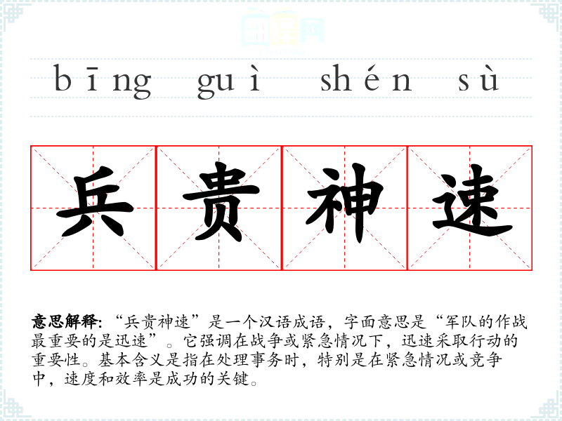 | 兵贵神速 | 神速:特别迅速。用兵贵在行动特别迅速。 |