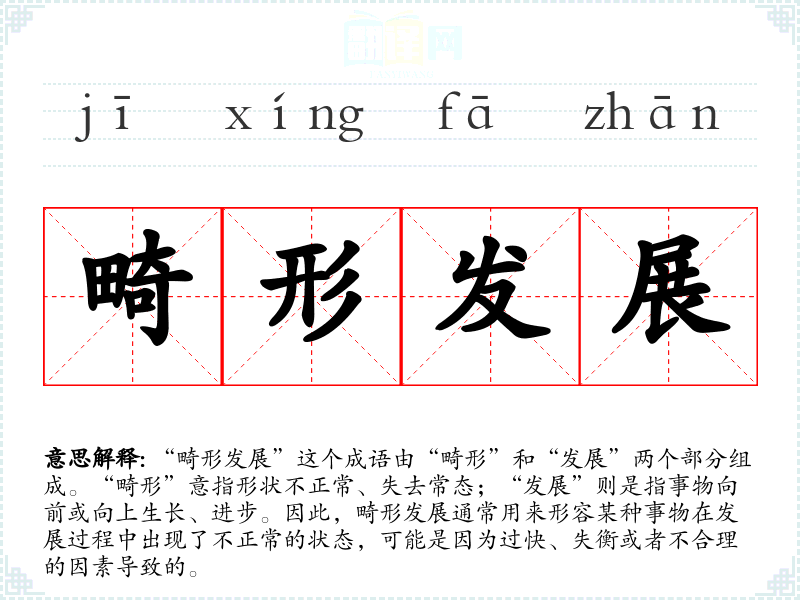 “畸形发展”这个成语由“畸形”和“发展”两个部分组成。“畸形”意指形状不正常、失去常态;“发展”则是指事物向前或向上生长、进步。因此,畸形发展通常用来形容某种事物在发展过程中出现了不正常的状态,可能是因为过快、失衡或者不合理的因素导致的。