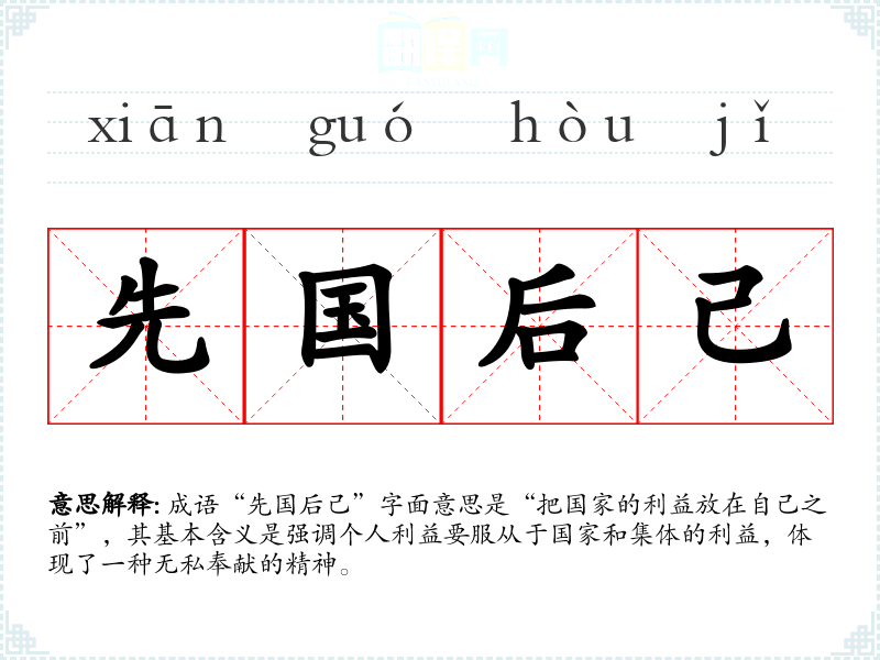 成语“先国后己”字面意思是“把国家的利益放在自己之前”,其基本含义是强调个人利益要服从于国家和集体的利益,体现了一种无私奉献的精神。