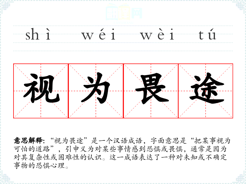 “视为畏途”是一个汉语成语,字面意思是“把某事视为可怕的道路”,引申义为对某些事情感到恐惧或畏惧,通常是因为对其复杂性或困难性的认识。这一成语表达了一种对未知或不确定事物的恐惧心理。
