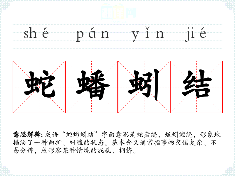 成语“蛇蟠蚓结”字面意思是蛇盘绕,蚯蚓缠绕,形象地描绘了一种曲折、纠缠的状态。基本含义通常指事物交错复杂、不易分辨,或形容某种情境的混乱、拥挤。