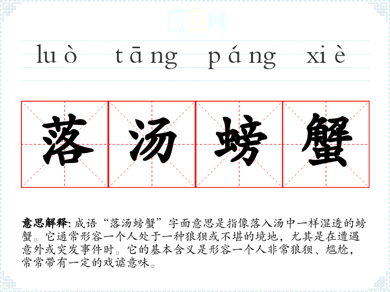 成语“落汤螃蟹”字面意思是指像落入汤中一样湿透的螃蟹。它通常形容一个人处于一种狼狈或不堪的境地,尤其是在遭遇意外或突发**时。它的基本含义是形容一个人非常狼狈、尴尬,常常带有一定的戏谑意味。