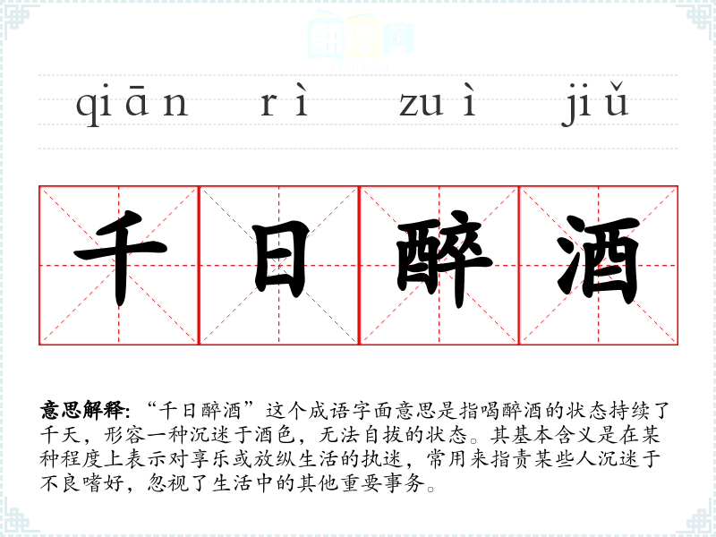 “千日醉酒”这个成语字面意思是指喝醉酒的状态持续了千天,形容一种沉迷于酒色,无法自拔的状态。其基本含义是在某种程度上表示对享乐或放纵生活的执迷,常用来指责某些人沉迷于不良嗜好,忽视了生活中的其他重要事务。