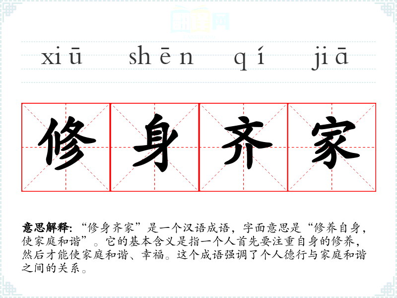 “修身齐家”是一个汉语成语,字面意思是“修养自身,使家庭和谐”。它的基本含义是指一个人首先要注重自身的修养,然后才能使家庭和谐、幸福。这个成语强调了个人德行与家庭和谐之间的关系。