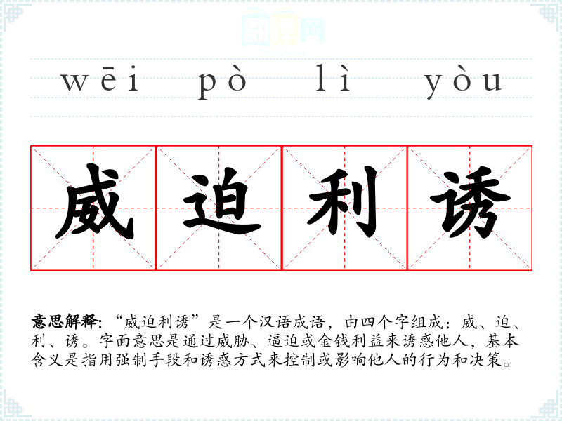“威迫利诱”是一个汉语成语,由四个字组成:威、迫、利、诱。字面意思是通过威胁、逼迫或金钱利益来诱惑他人,基本含义是指用强制手段和诱惑方式来控制或影响他人的行为和决策。