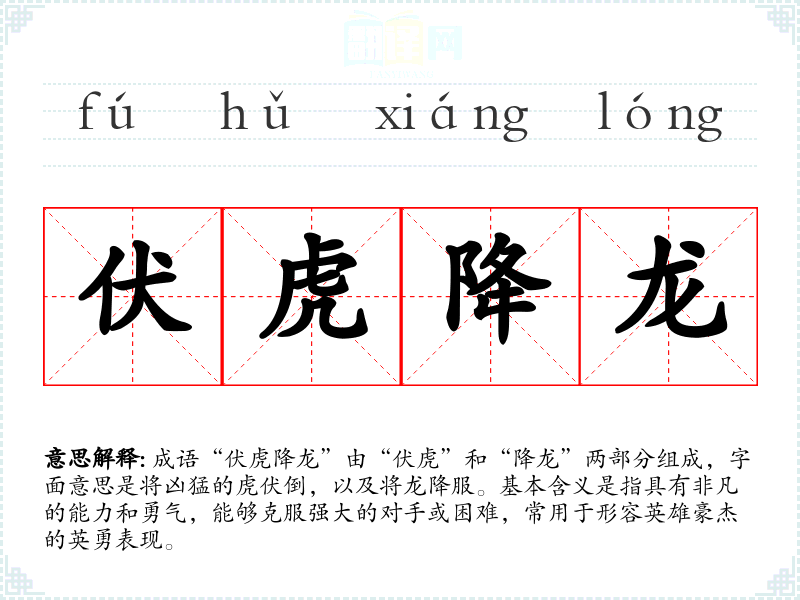 成语“伏虎降龙”由“伏虎”和“降龙”两部分组成,字面意思是将凶猛的虎伏倒,以及将龙降服。基本含义是指具有非凡的能力和勇气,能够克服强大的对手或困难,常用于形容英雄豪杰的英勇表现。