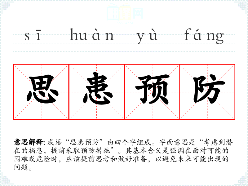 成语“思患预防”由四个字组成。字面意思是“考虑到潜在的祸患,提前采取预防措施”。其基本含义是强调在面对可能的困难或危险时,应该提前思考和做好准备,以避免未来可能出现的问题。
