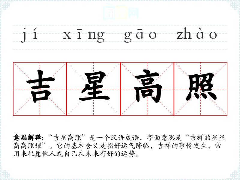“吉星高照”是一个汉语成语,字面意思是“吉祥的星星高高照耀”。它的基本含义是指好运气降临,吉祥的事情发生,常用来祝愿他人或自己在未来有好的运势。