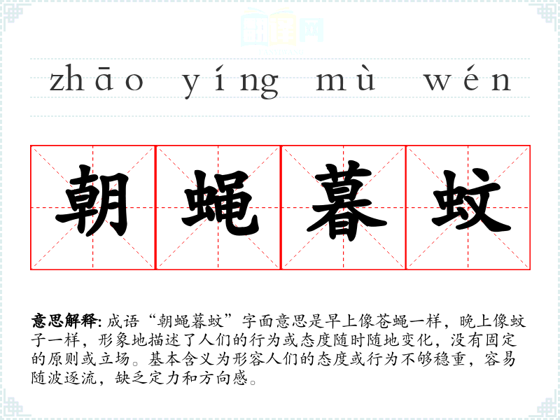 成语“朝蝇暮蚊”字面意思是早上像苍蝇一样,晚上像蚊子一样,形象地描述了人们的行为或态度随时随地变化,没有固定的原则或立场。基本含义为形容人们的态度或行为不够稳重,容易随波逐流,缺乏定力和方向感。