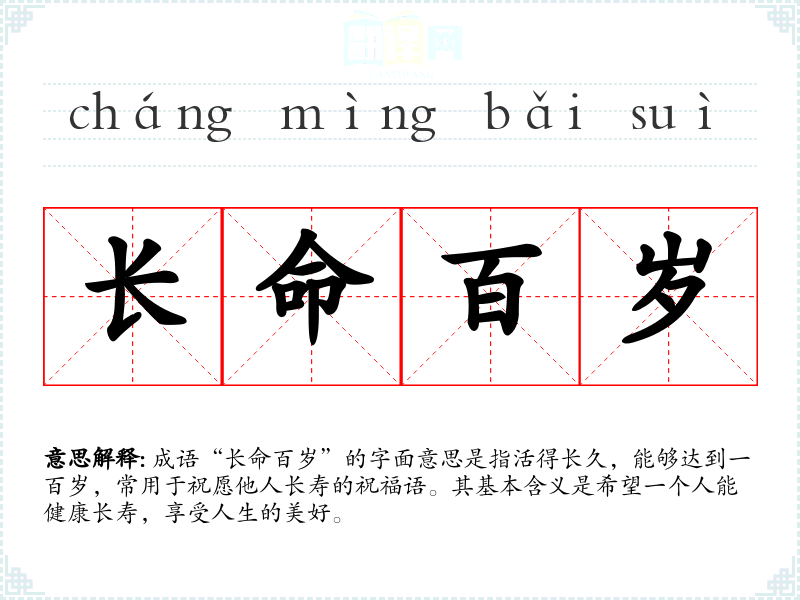 成语“长命百岁”的字面意思是指活得长久,能够达到一百岁,常用于祝愿他人长寿的祝福语。其基本含义是希望一个人能健康长寿,享受人生的美好。