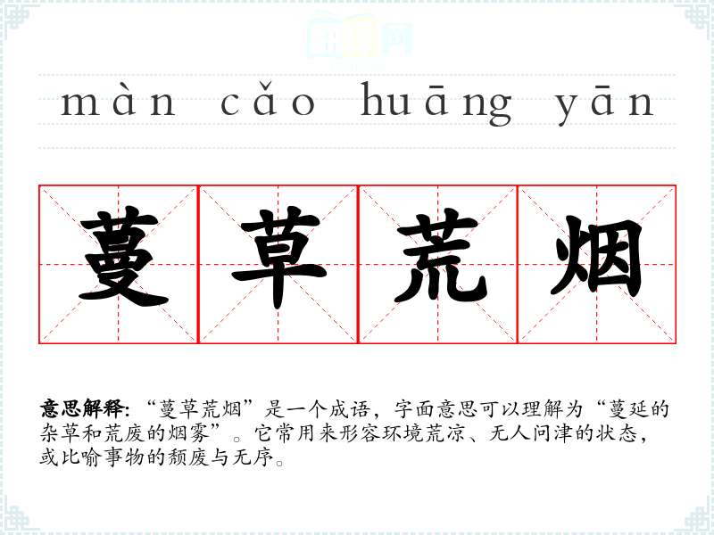 “蔓草荒烟”是一个成语,字面意思可以理解为“蔓延的杂草和荒废的烟雾”。它常用来形容环境荒凉、无人问津的状态,或比喻事物的颓废与无序。