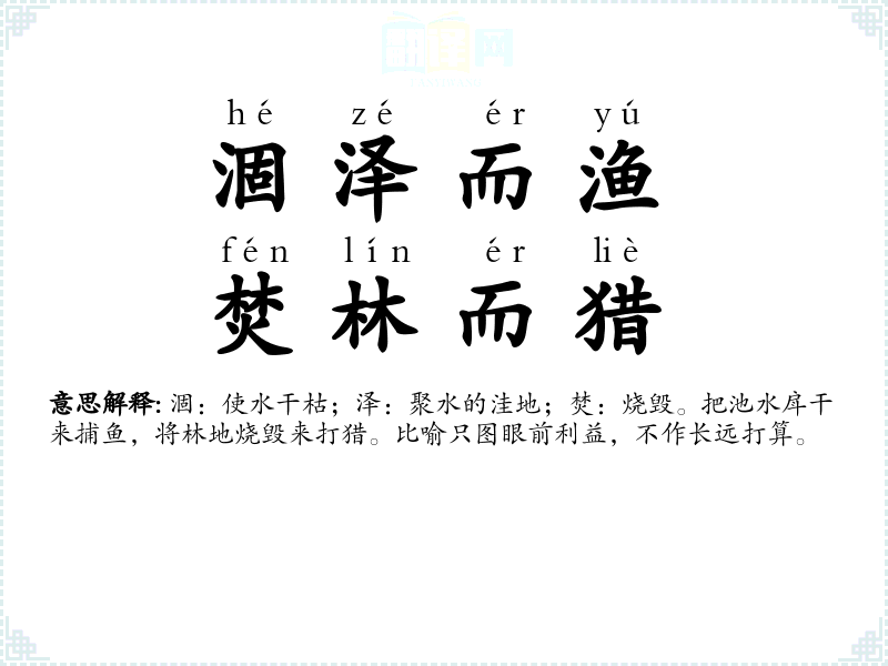 涸:使水干枯;泽:聚水的洼地;焚:烧毁。把池水戽干来捕鱼,将林地烧毁来打猎。比喻只图眼前利益,不作长远打算。