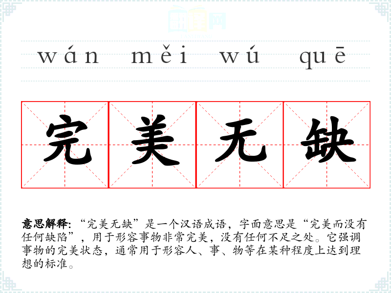 “完美无缺”是一个汉语成语,字面意思是“完美而没有任何缺陷”,用于形容事物非常完美,没有任何不足之处。它强调事物的完美状态,通常用于形容人、事、物等在某种程度上达到理想的标准。