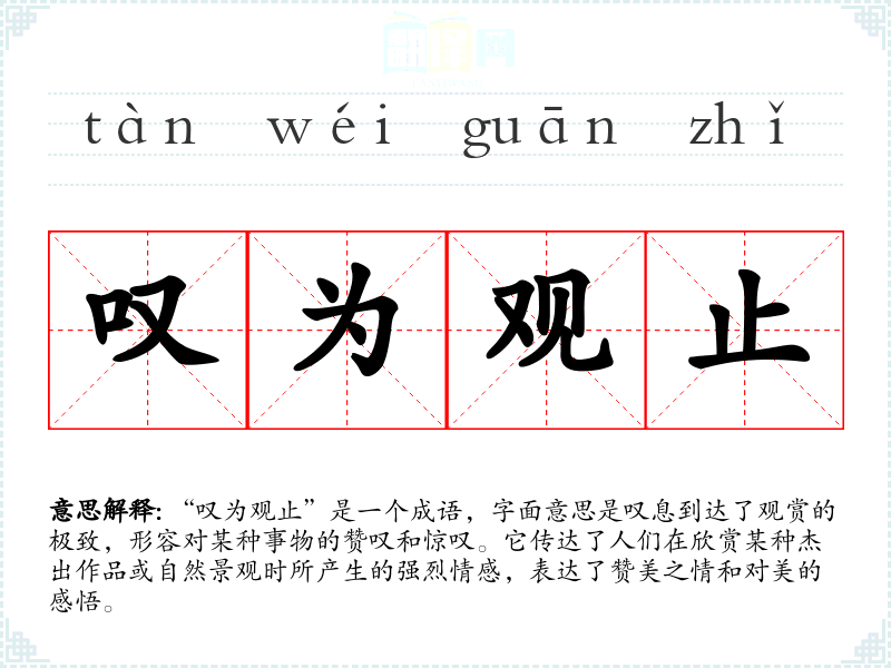 “叹为观止”是一个成语,字面意思是叹息到达了观赏的极致,形容对某种事物的赞叹和惊叹。它传达了人们在欣赏某种杰出作品或自然景观时所产生的强烈情感,表达了赞美之情和对美的感悟。