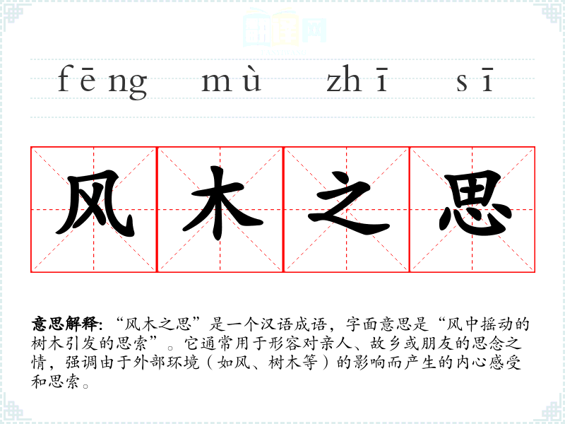 - 同义成语:如“思乡之情”、“相思之苦”,这些成语都表达了思念的情感,但“风木之思”更强调自然环境对思念的触发。
