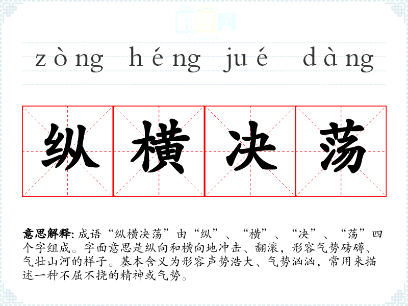 成语“纵横决荡”由“纵”、“横”、“决”、“荡”四个字组成。字面意思是纵向和横向地冲击、翻滚,形容气势磅礴、气壮山河的样子。基本含义为形容声势浩大、气势汹汹,常用来描述一种不屈不挠的精神或气势。