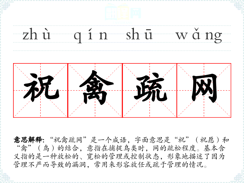 “祝禽疏网”是一个成语,字面意思是“祝”(祝愿)和“禽”(鸟)的结合,意指在捕捉鸟类时,网的疏松程度。基本含义指的是一种放松的、宽松的管理或控制状态,形象地描述了因为管理不严而导致的漏洞,常用来形容放任或疏于管理的情况。