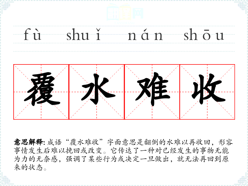 成语“覆水难收”字面意思是翻倒的水难以再收回,形容事情发生后难以挽回或改变。它传达了一种对已经发生的事物无能为力的无奈感,强调了某些行为或决定一旦做出,就无法再回到原来的状态。