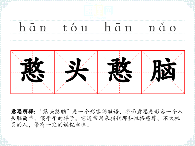 “憨头憨脑”是一个形容词短语,字面意思是形容一个人头脑简单、傻乎乎的样子。它通常用来指代那些性格憨厚、不太机灵的人,带有一定的调侃意味。