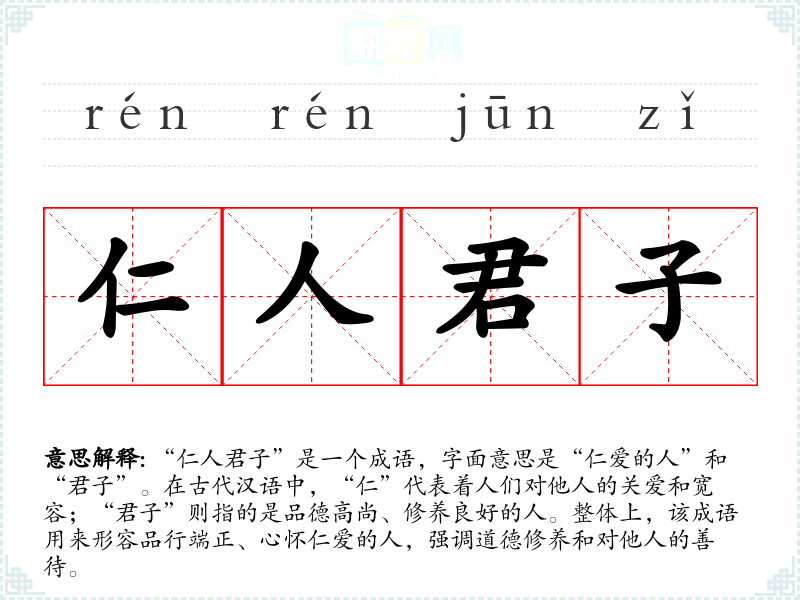 “仁人君子”是一个成语,字面意思是“仁爱的人”和“君子”。在古代汉语中,“仁”代表着人们对他人的关爱和宽容;“君子”则指的是品德高尚、修养良好的人。整体上,该成语用来形容品行端正、心怀仁爱的人,强调道德修养和对他人的善待。