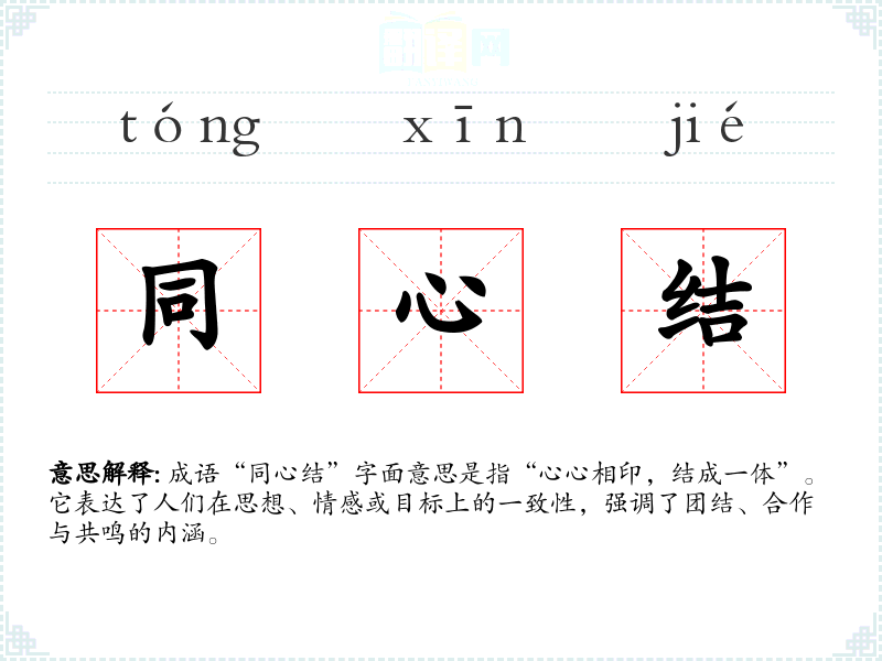 成语“同心结”字面意思是指“心心相印,结成一体”。它表达了人们在思想、情感或目标上的一致性,强调了团结、合作与共鸣的内涵。