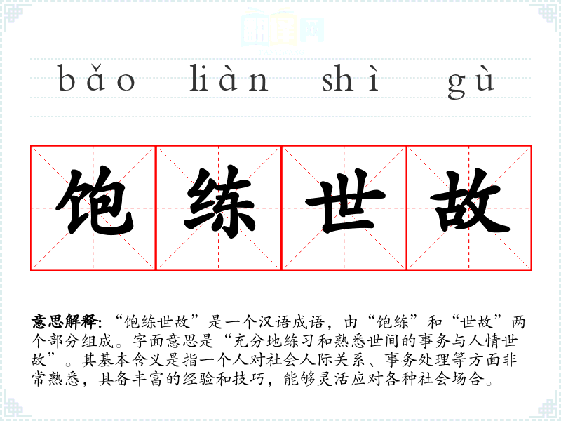 | 饱练世故 | 指对世态人情有深刻感受或有丰富的处世经验。同“饱谙世故”。 |