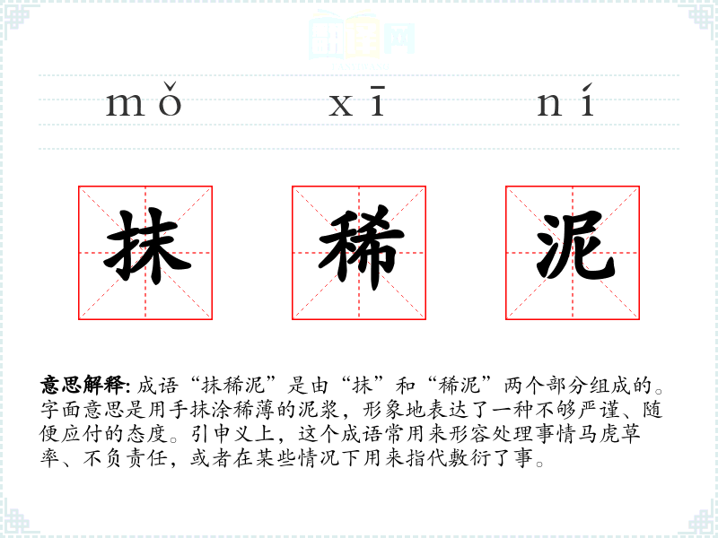 在各种语境中,“抹稀泥”可用于描述工作、学*、生活等方面的态度。例如,在职场中,某个员工对待工作不认真,结果造成了失误,可以说“他做事总是抹稀泥。”在学校中,老师可能会批评学生的作业态度不端正,认为他们“抹稀泥”。