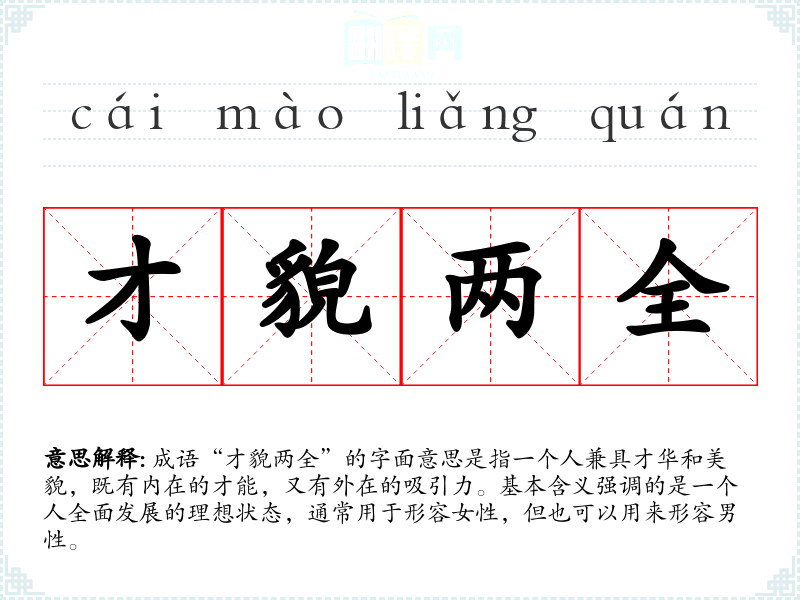 成语“才貌两全”的字面意思是指一个人兼具才华和美貌,既有内在的才能,又有外在的吸引力。基本含义强调的是一个人全面发展的理想状态,通常用于形容女性,但也可以用来形容男性。