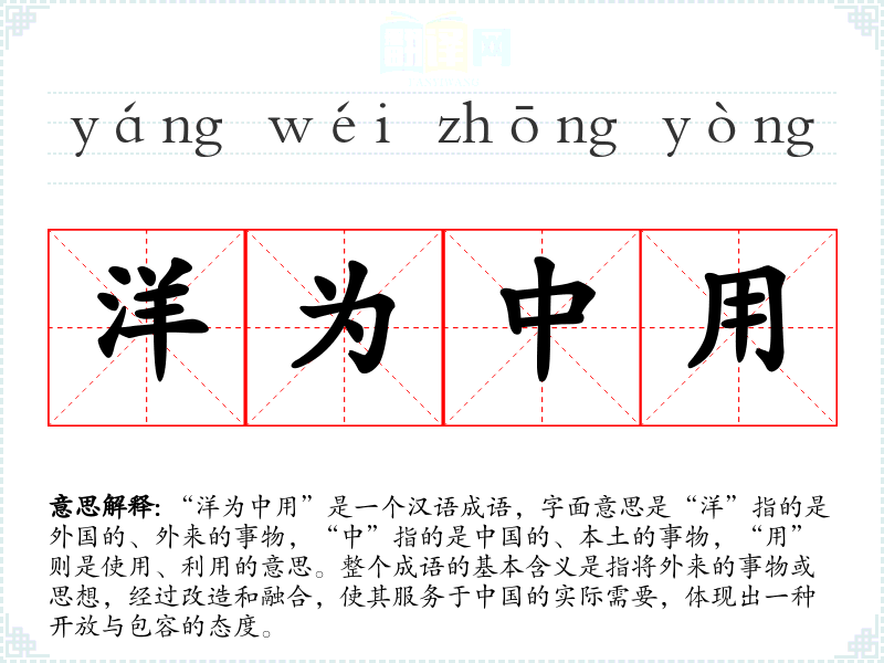 “洋为中用”是一个汉语成语,字面意思是“洋”指的是外国的、外来的事物,“中”指的是的、本土的事物,“用”则是使用、利用的意思。整个成语的基本含义是指将外来的事物或思想,经过改造和融合,使其服务于的实际需要,体现出一种开放与包容的态度。