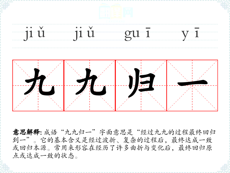 成语“九九归一”字面意思是“经过九九的过程最终回归到一”。它的基本含义是经过波折、复杂的过程后,最终达成一致或回归本源。常用来形容在经历了许多曲折与变化后,最终回归原点或达成一致的状态。