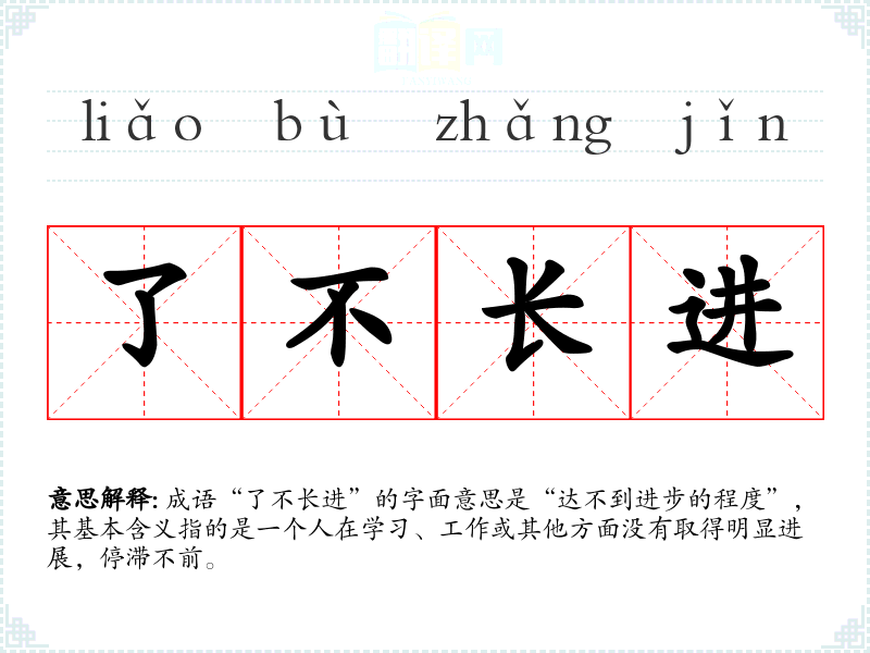 成语“了不长进”的字面意思是“达不到进步的程度”,其基本含义指的是一个人在学*、工作或其他方面没有取得明显进展,停滞不前。
