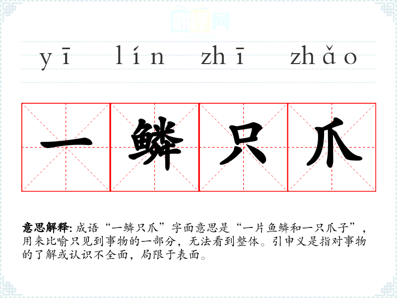 成语“一鳞只爪”字面意思是“一片鱼鳞和一只爪子”,用来比喻只见到事物的一部分,无法看到整体。引申义是指对事物的了解或认识不全面,局限于表面。