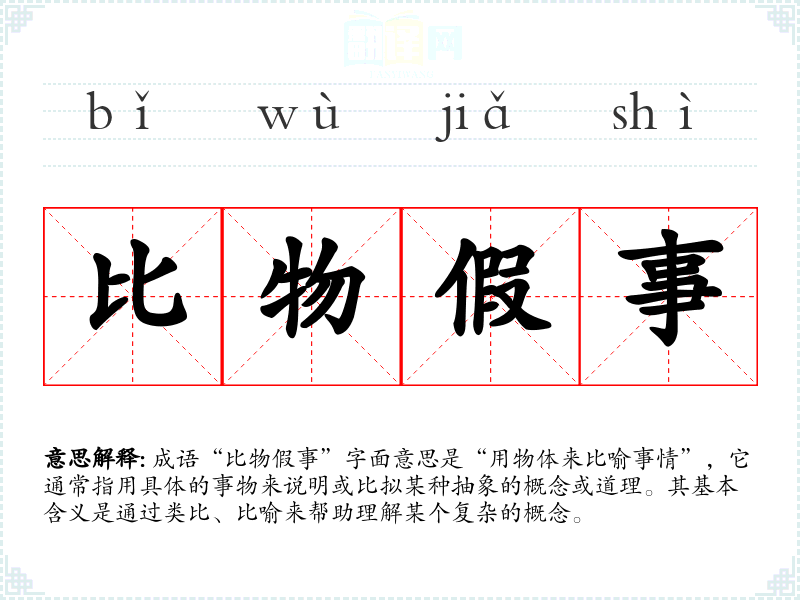 成语“比物假事”字面意思是“用物体来比喻事情”,它通常指用具体的事物来说明或比拟某种抽象的概念或道理。其基本含义是通过类比、比喻来帮助理解某个复杂的概念。