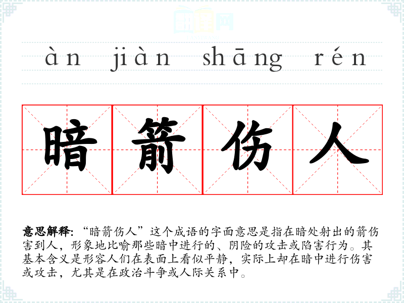 “暗箭伤人”这个成语的字面意思是指在暗处射出的箭伤害到人,形象地比喻那些暗中进行的、阴险的攻击或陷害行为。其基本含义是形容人们在表面上看似平静,实际上却在暗中进行伤害或攻击,尤其是在政治斗争或人际关系中。