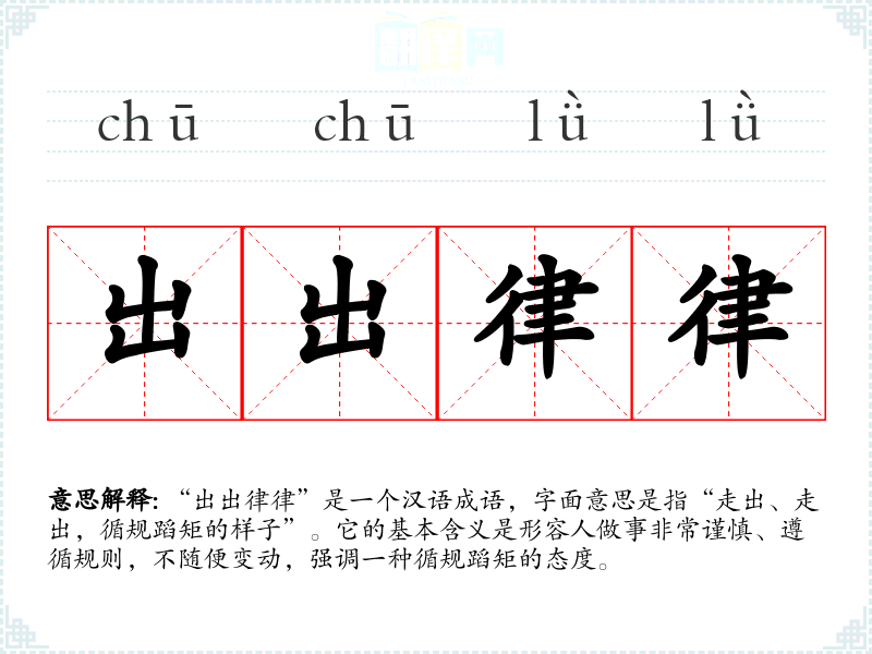 “出出律律”是一个汉语成语,字面意思是指“走出、走出,循规蹈矩的样子”。它的基本含义是形容人做事非常谨慎、遵循规则,不随便变动,强调一种循规蹈矩的态度。