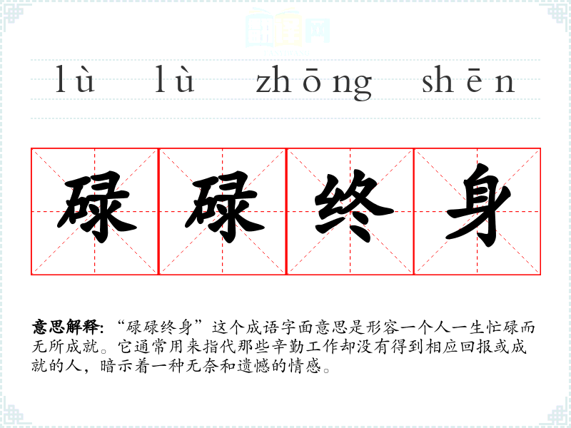“碌碌终身”这个成语字面意思是形容一个人一生忙碌而无所成就。它通常用来指代那些辛勤工作却没有得到相应回报或成就的人,暗示着一种无奈和遗憾的情感。