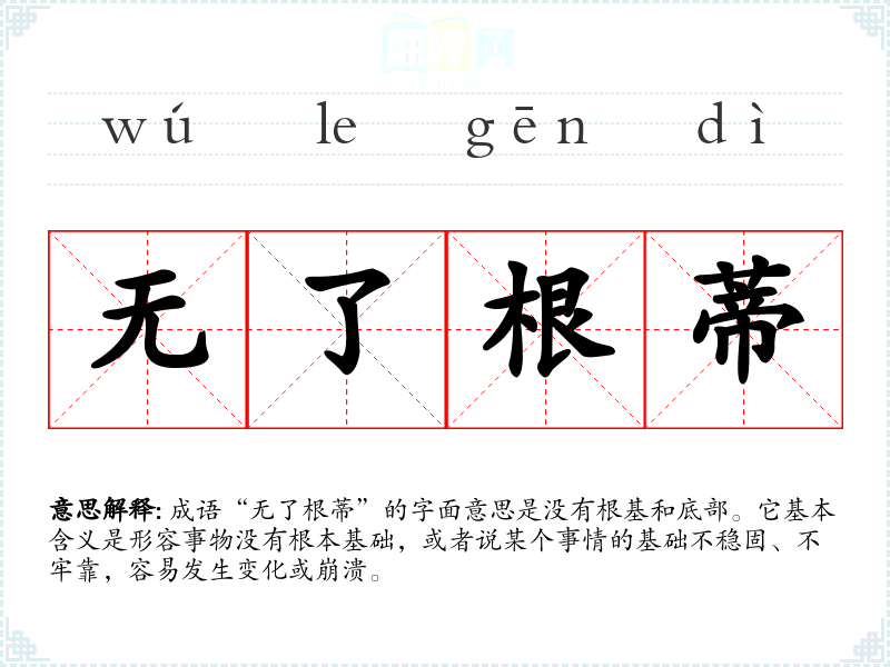 成语“无了根蒂”的字面意思是没有根基和底部。它基本含义是形容事物没有根本基础,或者说某个事情的基础不稳固、不牢靠,容易发生变化或崩溃。