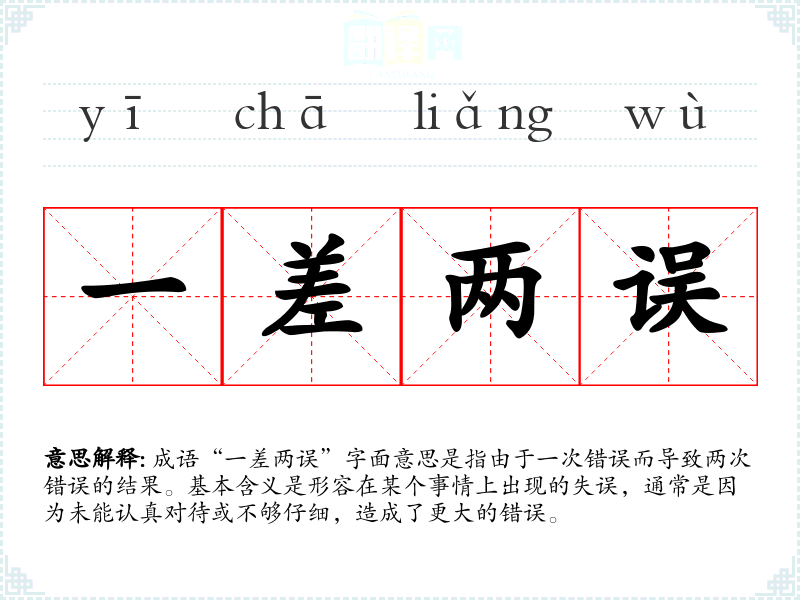 成语“一差两误”字面意思是指由于一次错误而导致两次错误的结果。基本含义是形容在某个事情上出现的失误,通常是因为未能认真对待或不够仔细,造成了更大的错误。