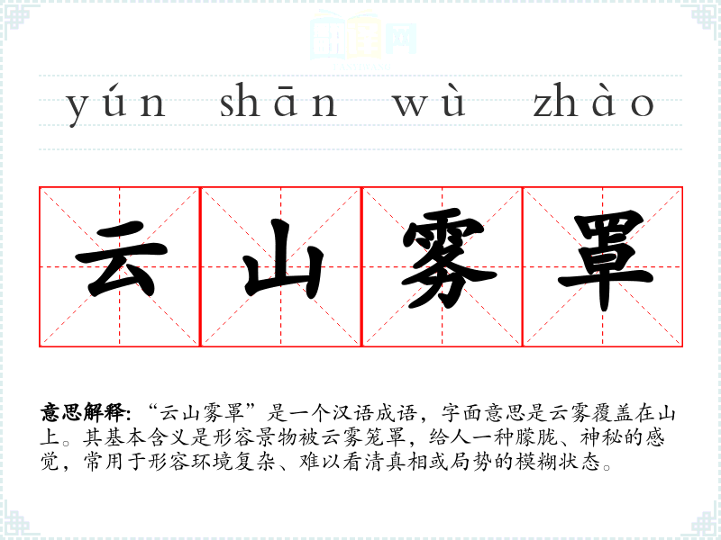 “云山雾罩”是一个汉语成语,字面意思是云雾覆盖在山上。其基本含义是形容景物被云雾笼罩,给人一种朦胧、神秘的感觉,常用于形容环境复杂、难以看清真相或局势的模糊状态。
