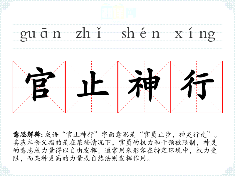 成语“官止神行”字面意思是“官员止步,神灵行走”。其基本含义指的是在某些情况下,官员的权力和干预被限制,神灵的意志或力量得以自由发挥。通常用来形容在特定环境中,权力受限,而某种更高的力量或自然法则发挥作用。