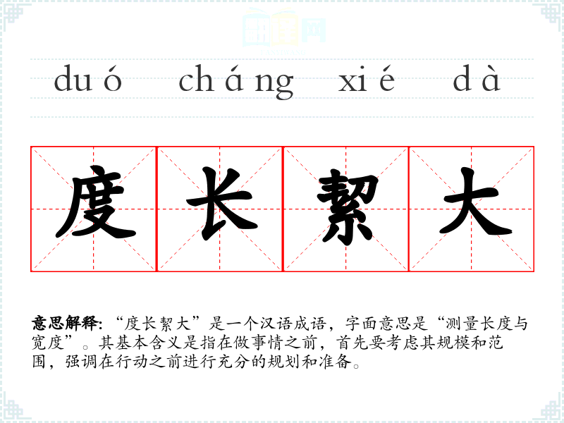 “度长絜大”是一个汉语成语,字面意思是“测量长度与宽度”。其基本含义是指在做事情之前,首先要考虑其规模和范围,强调在行动之前进行充分的规划和准备。