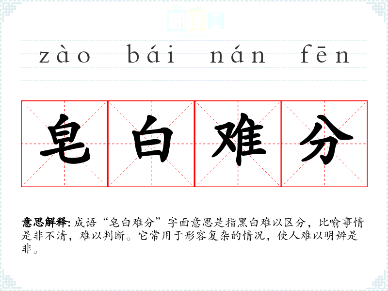 成语“皂白难分”字面意思是指黑白难以区分,比喻事情是非不清,难以判断。它常用于形容复杂的情况,使人难以明辨是非。