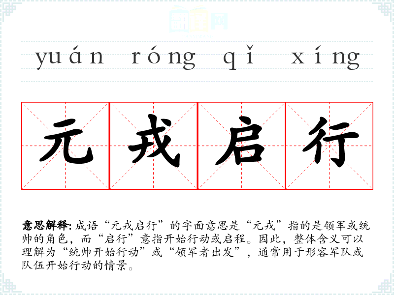 成语“元戎启行”的字面意思是“元戎”指的是领军或统帅的角色,而“启行”意指开始行动或启程。因此,整体含义可以理解为“统帅开始行动”或“领军者出发”,通常用于形容军队或队伍开始行动的情景。