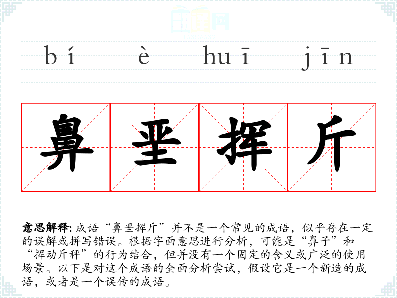 由于“鼻垩挥斤”并无历史典故或文献出处,可以推测它可能源于某种方言或网络用语,亦或是对其他成语的误读或误写。