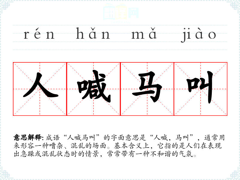 成语“人喊马叫”的字面意思是“人喊,马叫”,通常用来形容一种嘈杂、混乱的场面。基本含义上,它指的是人们在表现出急躁或混乱状态时的情景,常常带有一种不和谐的气氛。
