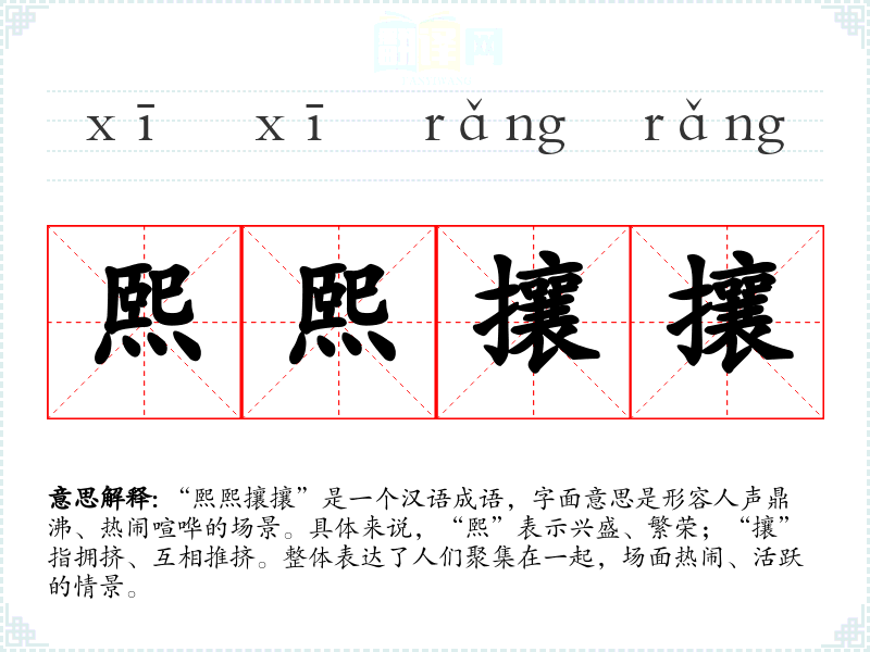 “熙熙攘攘”是一个汉语成语,字面意思是形容人声鼎沸、热闹喧哗的场景。具体来说,“熙”表示兴盛、繁荣;“攘”指拥挤、互相推挤。整体表达了人们聚集在一起,场面热闹、活跃的情景。